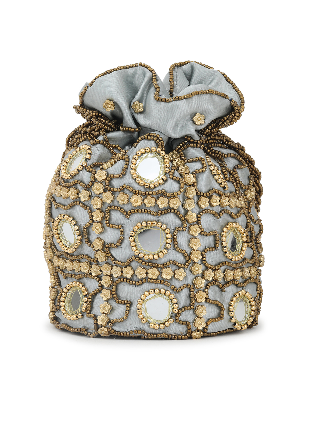 Beige embellished potli Has wrist loop 1 main compartment with drawstring closure Size & Fit Size : 9 x 9