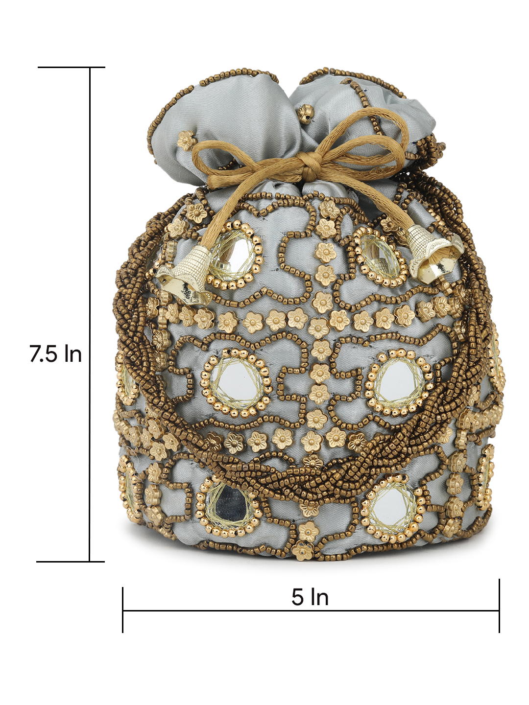 This product is a combo of tow Embellished potli bags having wrist loop 1 main compartment each with drawstring closure. Size & Fit Size of each potli bag : 9 x 9 x 3 Inch (Length x Width x Depth ) Material & Care Fabric Wipe with clean, dry cloth
