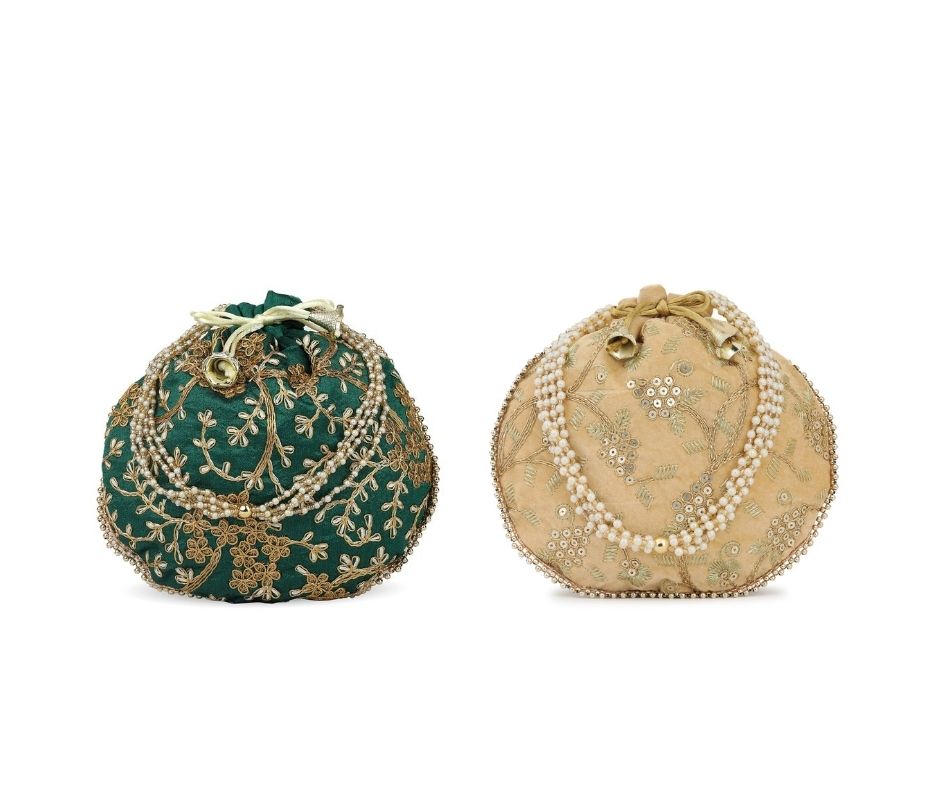 Combo of Beige & Green Color Designer Embroidered Potli Bag